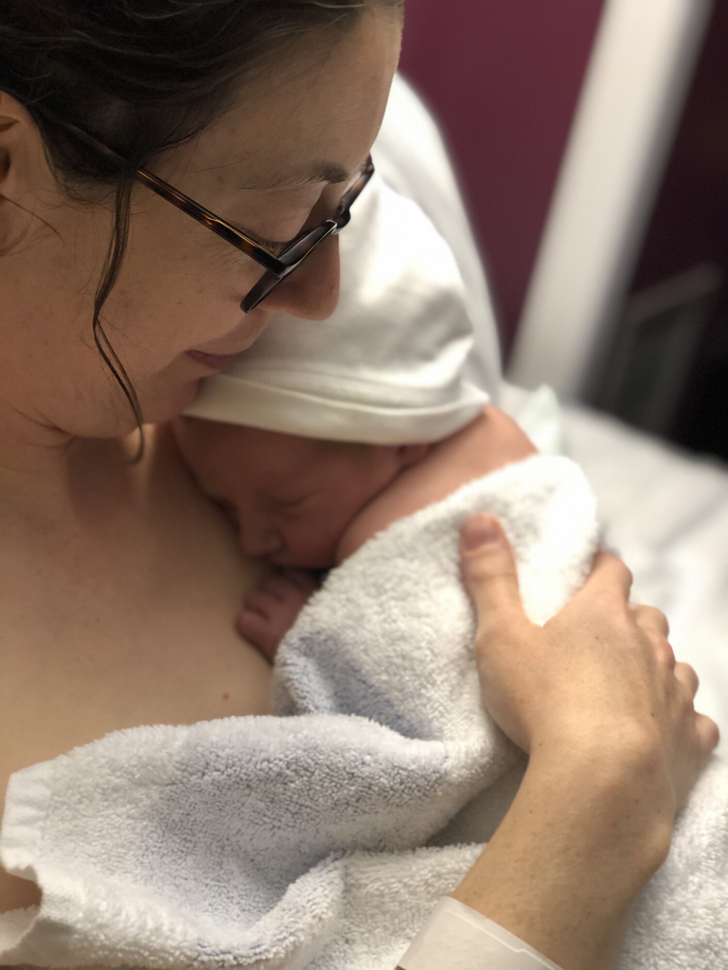 My labour was fast and intense with the contractions starting around 4am and Arlo arriving at midday. Everything the course taught us, along with a bit of pregnancy yoga and my own research, gave me confidence in what was an overwhelming and unknown experience. I was breathing, groaning and stamping my way through the contractions, but any feelings of self-consciousness went out the window! We arrived at the Birth Centre at 8am and I was already 5cm dilated. The pool was amazing and really helped with the pain. The contractions were so intense I felt too queasy to even try gas and air and somehow managed the whole birth without any pain relief. The Lewisham Birth Centre midwives were amazing. They read and respected our birth preferences and presented any suggestions as options. Despite the contractions still being strong, I wasn't making much progress in the pool so my midwife suggested I get out and try the birthing stool, which helped Arlo get into a better position. Then I moved onto the bed and two more midwives were called in. They took a leg each and with Joss behind me, all cheering me on, Arlo was born!