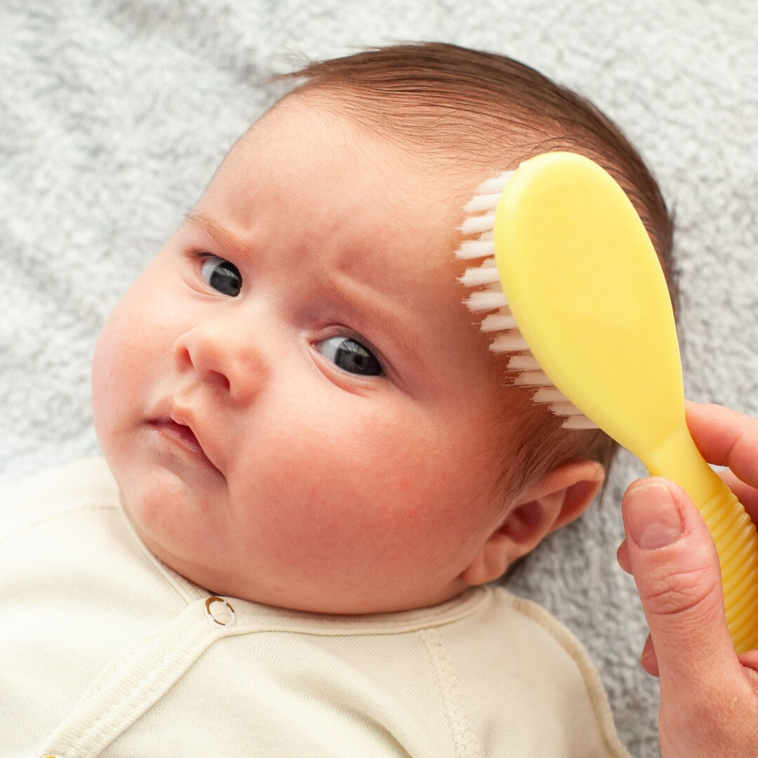 Regularly wash your baby’s hair with baby shampoo and use a soft brush to gently brush the loose flakes out. You can buy special cradle cap brushes from your pharmacy but any soft brush should do the trick.